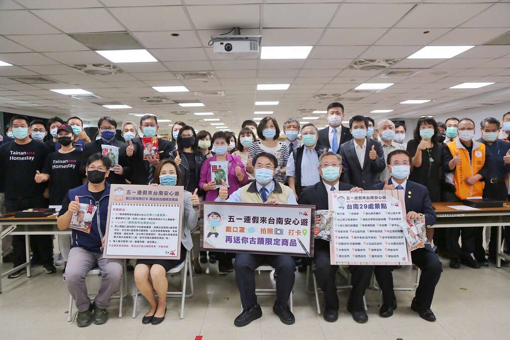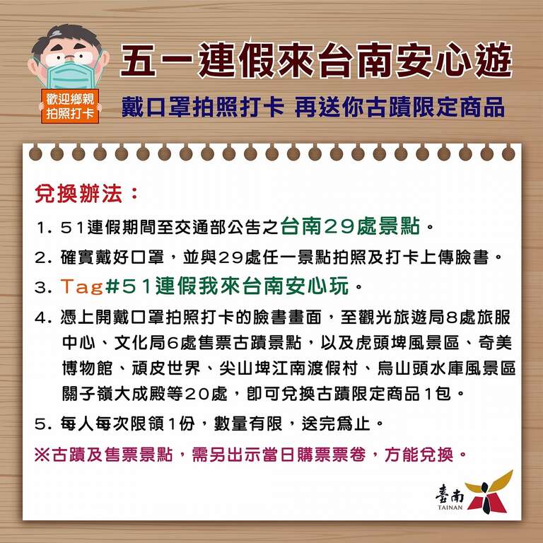 对于防疫,黄市长表示中央跟地方的出发点是一致的,也指示观旅局务必向业者及游客说明中央推出灯号的用意,更呼吁民众户外走访也应做好防疫措施,保持社交距离、勤洗手并将口罩戴好戴满,这次连假请观旅局整合业者推出售的「五一连假安心游台南」活动,就是要请大家出门做好自我健康管理并戴好口罩,凡于五一连假期间走访本次列入交通部「1968」APP的台南29处景点,上传戴好口罩与景点拍照打卡的照片,并标注「#51连假我来台南安心游」,即可凭上开戴口罩拍照打卡的脸书画面,至观光旅游局8处旅服中心、文化局6处售票古迹景点,以及虎头埤风景区、奇美博物馆、顽皮世界、尖山埤江南渡假村、乌山头风景区等20处(售票景点需另出示当日购票票卷),即可兑换古迹限定商品1包。总计3,000包,数量有限,如果反应良好,请观旅局再来追加!
