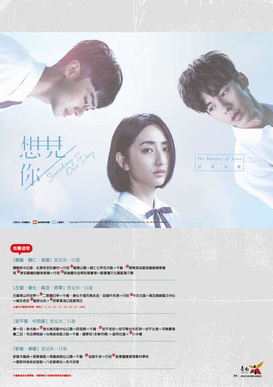 台南市市长黄伟哲专注推动台南为观光城市,对于戏剧来到台南取景拍摄,帮忙行销台南,非常欢迎,也乐于给予协助。台剧「想见你」以穿越与悬疑推理的剧情题材,播出后引发高度社群声量,其拍摄地也间接成为粉丝踩点的热门去处。该剧在台湾多个县市进行拍摄,其中主角们的校园生活就是在台南多区取景拍摄,为让游客不需烧脑就能清松朝圣,台南市政府观光旅游局与文化局共洽卫视中文台及三鳯制作公司取得授权后,合作出版「想见你戏剧景点导览地图」,汇集该剧台南取景景点及美食资讯,带领粉丝重温剧情,该剧5月16日起已于卫视中文台每周六晚上10点精彩再见,观众可一边看剧一边与男女主角一同穿越时空、寻找该剧在台南出现的"蛛丝马迹"。
