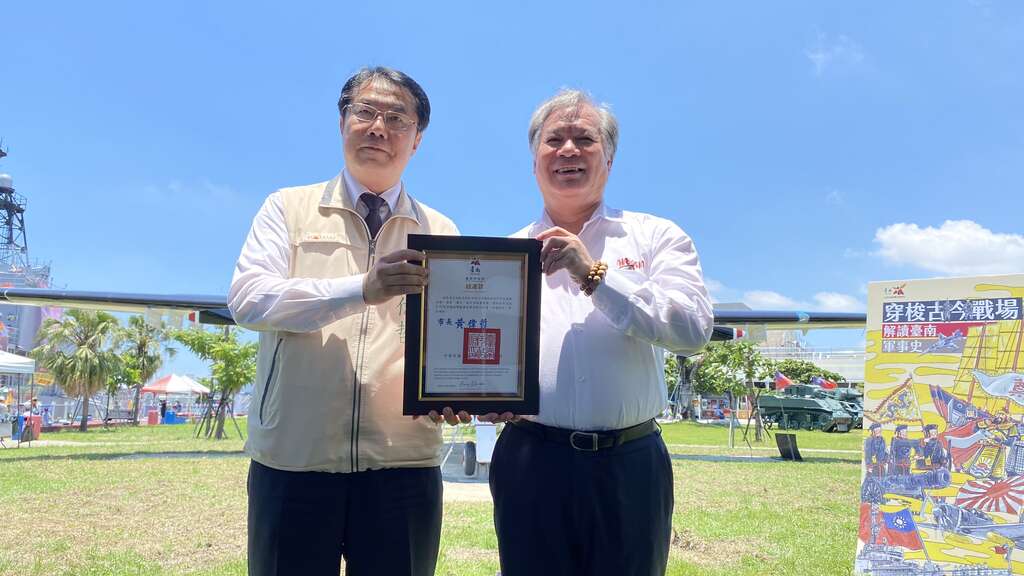 南市观旅局局长郭贞慧表示,这次推出的「穿梭古今战场解读台南军事史」插画折页地图,从军史的角度看台南,介绍各战事遗址、其历史背景及各大军机设备展示共43个景点。美术编辑的部分则邀请了知名插画家Croter洪添贤进行规划设计,本身也是军事迷的他,运用简单三色与颜色深浅带出插画的光影变化及怀旧感,借以唤醒人们对于那个艰辛年代的记忆与怀念。另外郭局长也表示, 7月15日刚于德阳舰园区架设完成的S-2T反潜机,除引擎外,军机本身完全是原汁原味,整个的移设过程是一个成功的公私协力模式,结合了公部门及民间的力量,不仅节省了公帑,也缩短了采购的行政程序。再次感谢国防部空军司令部的协助,并要特别感谢亚航的大力赞助,整体移展过程中不论是机体的拆卸或者组装,都是大工程,真的是集众人之力成就这件美事。而军机的后续维运,也必需仰赖文化局的协助与帮忙,另亚航董事长兼总经理卢天麟也表示飞机的拆迁除高额费用外还耗时耗力,但作为台南在地企业回馈给在地居民亚航责无旁贷要提供协助,同时感谢黄市长替台南市民争取到这架退役反潜机并落址在德洋舰园区、另外也感谢财团法人台南市台日文化友好交流基金会董事长李退之先生、文化局副局长周雅菁、安平区区长赖青足、空军第六混合联队反潜作战大队副大队长李俊峰上校、空军第一联队上校政战主任李庆熙及共同协助的国军长官、波音公司刘劭群经理,另外还有吴禹寰议员、林美燕议员、 Ingay Tali颖艾达利议员、蔡筱薇议员、吕维胤议员、李启维议员、沉震东议员、周丽津议员以及各立委与议员服务处代表等的支持,才得以让台南市民及外地游客认识这台执勤半世纪、守护台海安全的S-2T军机的样貌,后续的维护亚航每年也将会协助编列预算作为部分的维护费用,期许这台军机能够得以在此落脚、成长及开枝散叶。