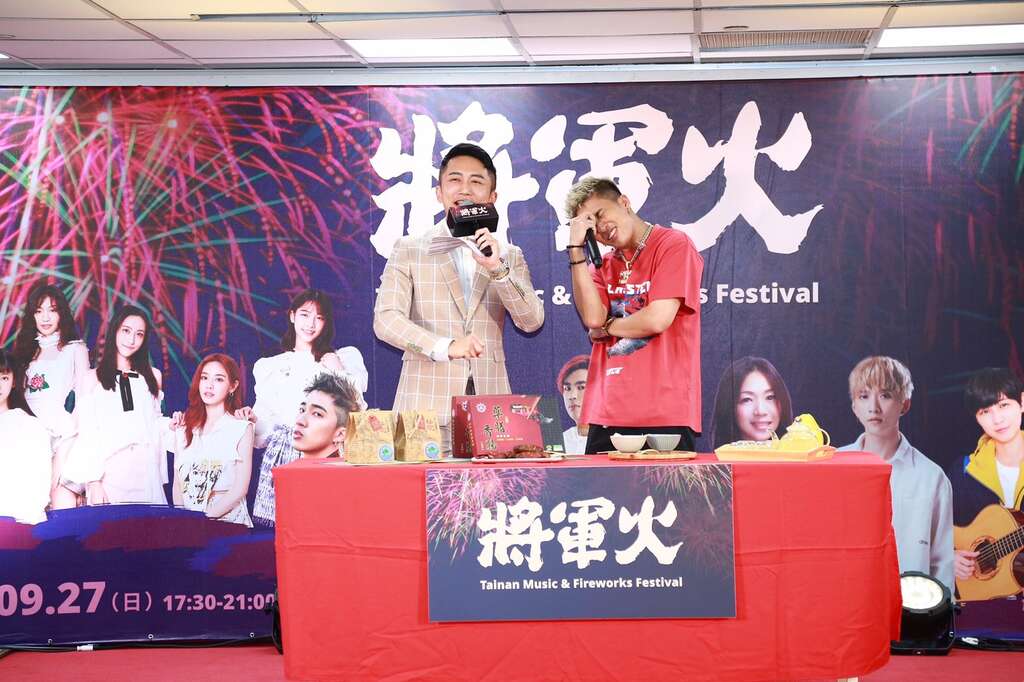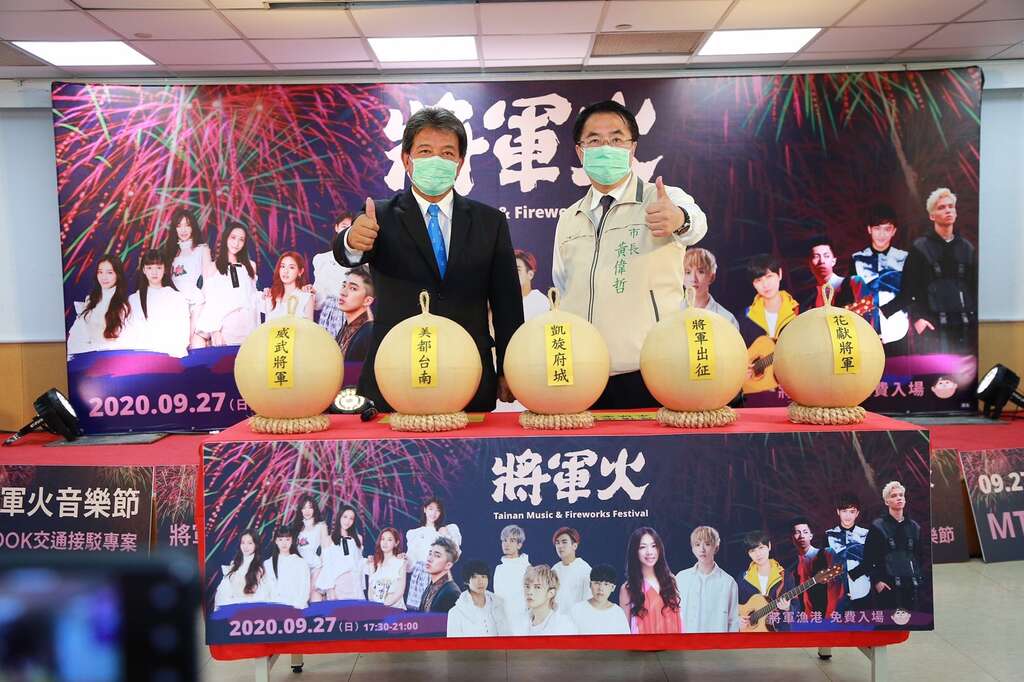 今(9/22)日台南市黄伟哲市长、台南市议会郭信良议长、台南市政府观光旅游局林国华副局长、交通部观光局云嘉南滨海国家风景区管理洪肇昌副处长、将军区公所洪聪发区长、许至椿议员、吕维胤议员、沉震东议员、李启维议员、颖艾达利议员及各立委、议员服务处代表等贵宾特别出席活动记者会,记者会开场由唯一连续出席将军吼与将军火的新生代嘻哈天才娄峻硕为记者会炒热气氛,娄峻硕本身超爱台南,上周也刚来台南玩,下周也预计带家人再次玩台南,并推荐必喝牛肉汤、虱目鱼粥、香肠及麻豆文旦。记者会也由市长、议长共同上台提笔于祝福词「疫情退散.永保安康、人乐丰年.活动成功」纸张上亲笔签名并贴于花火弹上,预祝永保安康及活动圆满成功,期待满满的祝福话语绽放台南天空,也同时祈愿疫情速速退散。