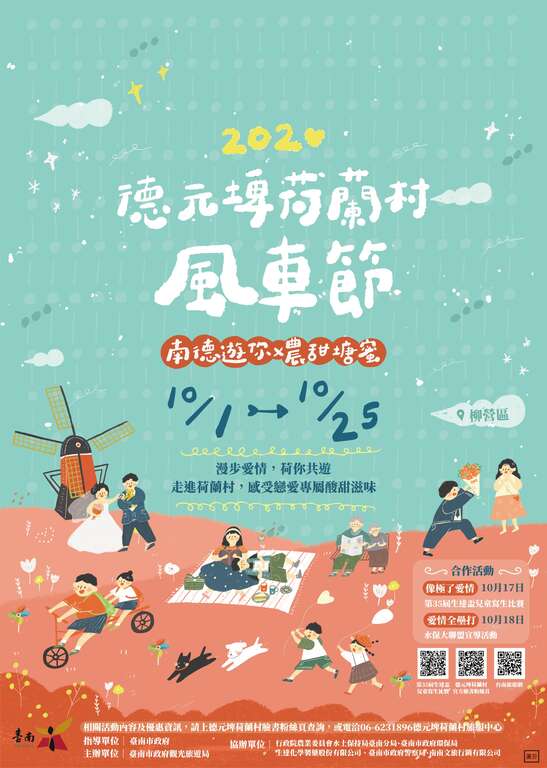 黄伟哲市长表示,全糖的台南欢迎大家携手来柳营德元埤荷兰村一起度过甜蜜蜜的悠闲时光,尽情享受迷人的异国乡村田野风光;活动期间园区里布满撩人的甜蜜情话,更有搭配情话主题的各式展品等着你来亲自领会!