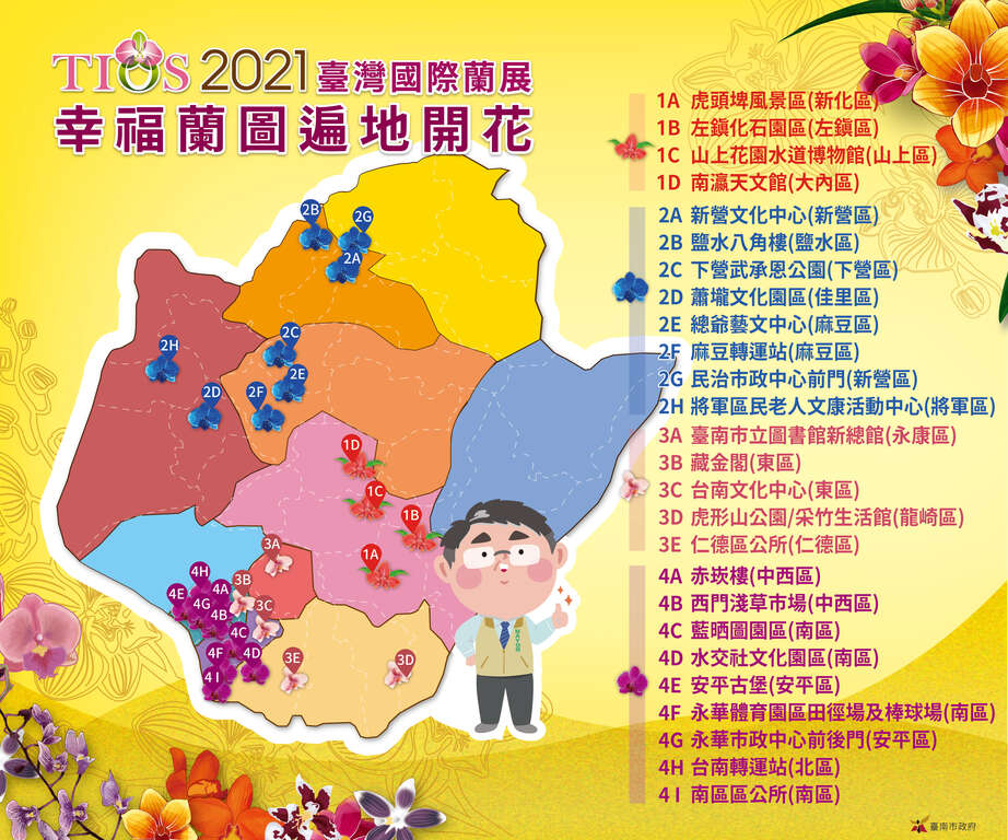 因新冠肺炎配合防疫, 2021台湾国际兰展不开展,原预计布置的3万株兰花将移置台南市24处景点,以「遍地开花」形式让民众近距离赏花。市长黄伟哲、议员李伟智、议员陈碧玉、议员许至椿、议员蔡旺诠、议员林志聪夫人余柷青、观旅局局长郭贞慧、新闻处处长苏恩恩、新化区长吴金喜等贵宾,今(19)日一起在虎头埤风景区公布「2021国际兰展遍地开花台南赏兰游程」。