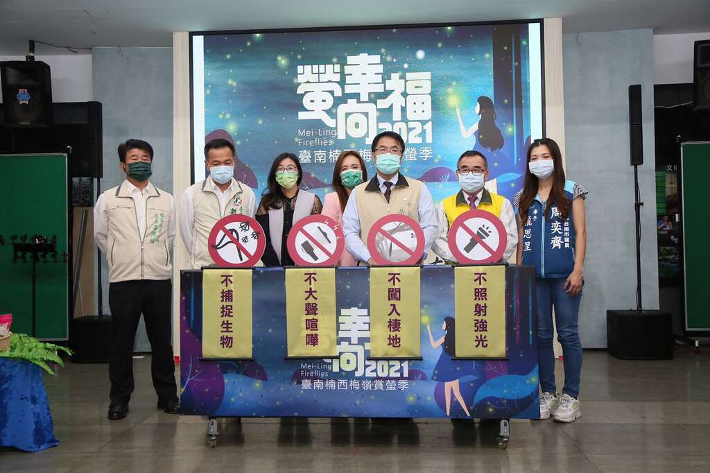 随着赏萤季节的到来,台南市政府今(15) 日上午于民治市政中心行政大楼举办「2021台南楠西梅岭赏萤季」行前活动暨防疫宣导记者会,由黄伟哲市长、观光旅游局郭贞慧局长、新闻及国际关系处苏恩恩处长、西拉雅国家风景区管理处许主龙处长、楠西区公所区长李鸿裕、沈家凤议员、郭清华议员、台南市梅岭休闲农业协会黄贵珍理事长、各立委议员服务处代表等贵宾出席,共同宣导赏萤四不「不捕捉、不喧哗、不直接照射、不破坏生态」,邀请大家来台南赏萤。