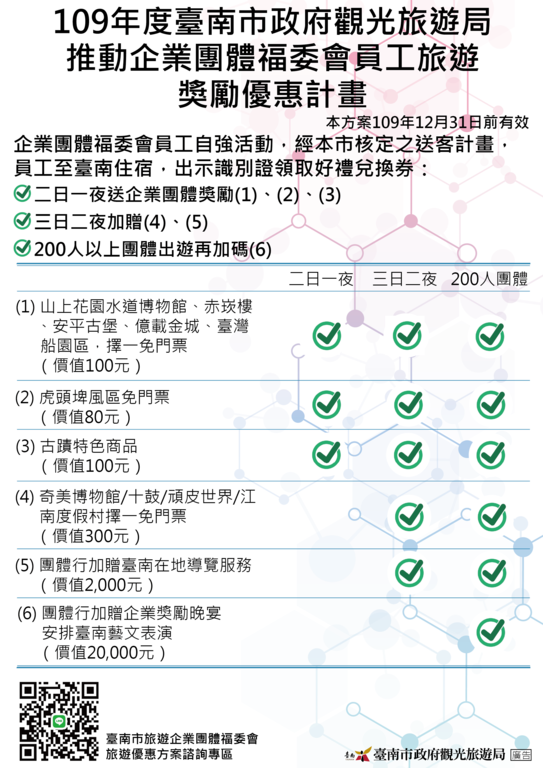 In order to welcome the post-epidemic era, revitalize the Greater Tainan tourism market, and promote the tourism consumption of employees of the corporate group Fu Committee to the city, the "109 Tainan Municipal Government Tourism and Tourism Bureau to promote the tourism incentives of employees of the corporate group Fu Committee" has been launched since July 1. The "Concessionary Plan" program encourages corporate employee groups to travel to Tainan.