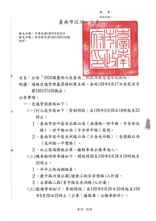 / Announcement 9/26 "2020 National Day Fireworks in Tainan" Trial Event Traffic Control Measures