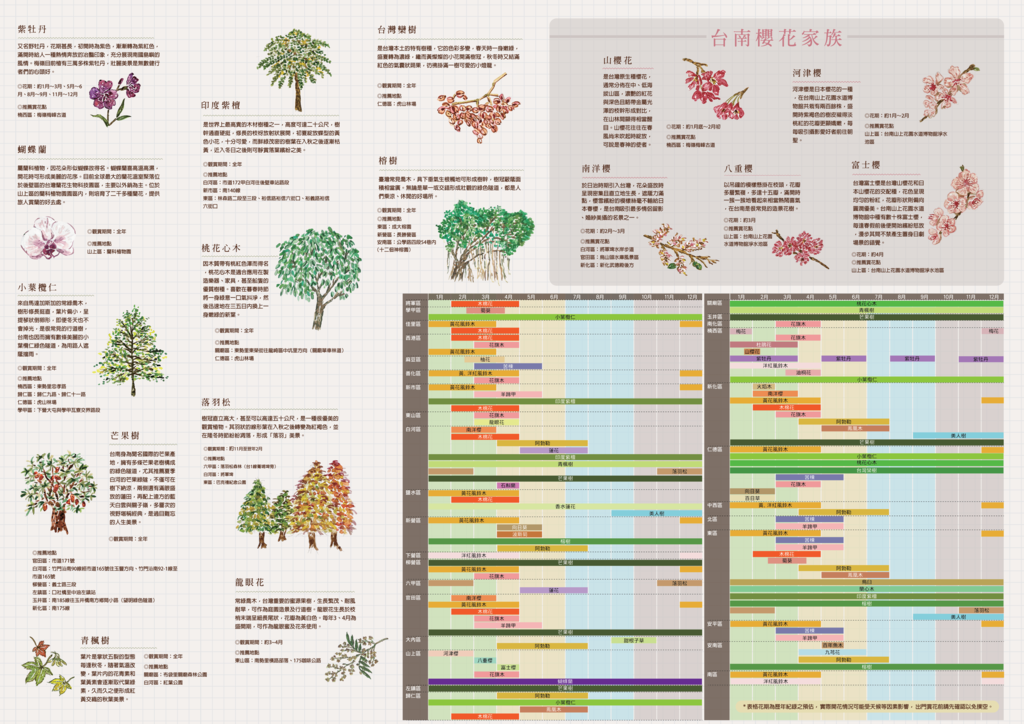 The Tainan City Government Tourism and Tourism Bureau stated that the “Southern Flower City” illustrated fold-out map was launched this time to gather information about the characteristic flowers and green tunnels in Tainan districts and provide multiple flower viewing spots in Tainan districts for travelers Grasp every moment of flowering, and you won't be stunned by missing the flowering period. For the art design part, Sybil He Qianyuan, who is also a writer, freelance illustrator, graphic and visual designer, was invited to conduct overall planning and design. She studied in Tainan when she was in college. She liked Tainan's life pace and creative environment very much. In 2013, she founded the "sybil-ho" design studio, engaged in illustration and design work. Plants are one of the most common themes in her illustration creation. I hope to transform the inspiration of nature into life objects, so that people can feel the beauty around them.