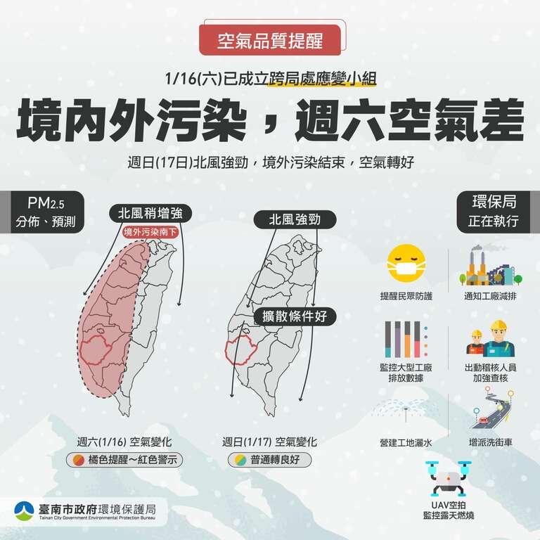 Air pollution reminder ! Air pollution at Xinying Station (AQI: 154) , Annan Station ( AQI: 156 ), and Tainan Station ( AQI: 160 ) at 7 am today (1/16) reached the first-level warning level. The mayor reminds everyone, Please remember to wear a mask when you go out due to bad empty products and avoid strenuous outdoor exercise
