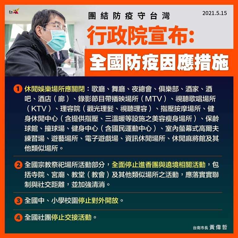 In addition to the national epidemic prevention measures regulated by the Executive Yuan, the Tainan City Government today (5/15) held an emergency inter-bureau meeting on epidemic prevention. The resolutions during the meeting were as follows: