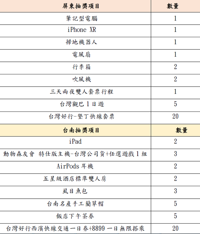 (2)身分証明書の表紙のコピーと原本の領収書(署名と押印が必要)を添付し、賞品の締め切り前に書留で送付してください。台南市安平区龍華路6号セクション6号台南賞10階(台南市)政府観光局)。 、屏東賞-番号527 Ziyou Road、Pingtung City(Pingtung County Government Transportation and Tourism Department)、主催者が正しいことを確認した後、賞のステータスに応じて、Chunghwa Postまたは宅配便を使用して、指定された場所に賞品を発送します。