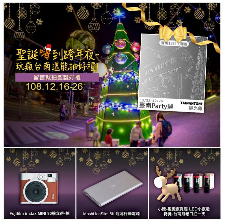此外,觀光旅遊局的台南旅遊臉書粉絲團也在主題週最後一個月推出歲末年終慶祝活動,推出粉絲好禮瘋狂加碼抽,自12月16日起至12月26日前在活動貼文下方按讚留言和小編說出最想來台南參加的聖誕跨年活動並分享活動貼文,即有機會獲得Fujifilm instax MINI 90 拍立得(1名)、Moshi IonSlim 5K 超薄行動電源(1名)、覓鹿 LED小夜燈(2名)及台南限量月老口紅(10名)!