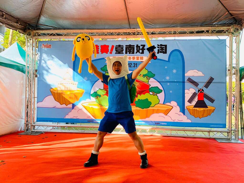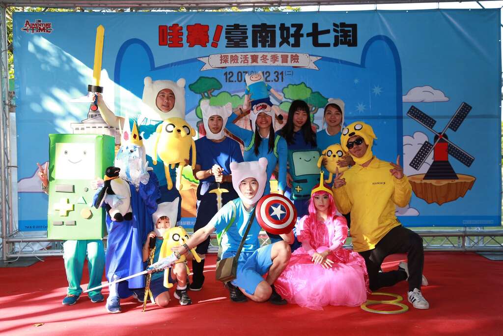 由臺南市政府觀光旅遊局主辦的「哇賽!臺南好七淘-探險活寶冬季冒險」繼12/7、8在安平樹屋的互動小遊戲,送出超吸睛的阿寶、老皮玩偶,獲民眾好評!為了滿足粉絲們期待,今(15)日特別安排粉絲見面會以及COSPLAY大賽,讓民眾一飽眼福!現場計有8組COSPLAY參賽隊伍,將自己裝扮成探險活寶裡的人物,個個都把角色發揮得淋漓盡致,最後由「台南的阿寶(FINN)來了」、「泡泡糖小公主」、「冰霸王」三組參賽者獲得前三名的高額獎金,參加隊伍也獲得探險活寶12吋玩偶1隻及限量筆記本1組!