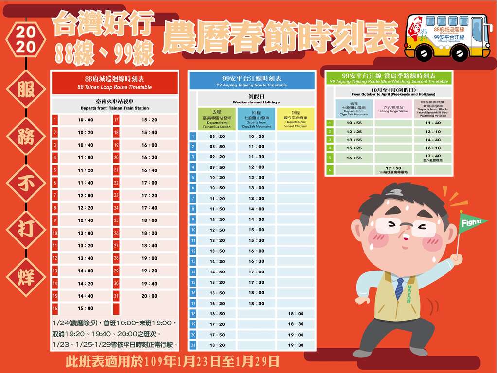88府城巡迴線於1/24(農曆除夕),首班10:00~未班19:00,取消19:20、19:40、20:00班次,1/23、1/25~1/29皆依平日時刻表行駛(首班10:00~未班20:00,每20分鐘一班次,每日共計行駛31班次);99安平台江線於1/23~1/29依例假日時刻表行駛(首班08:20,每30分鐘一班次,每日共計行駛42班次),便利遊客透過密集的大眾運輸班次,輕鬆走訪舊府城、安平、七股沿海等各大觀光景點,歡迎春節期間要到臺南旅遊的民眾踴躍搭乘。