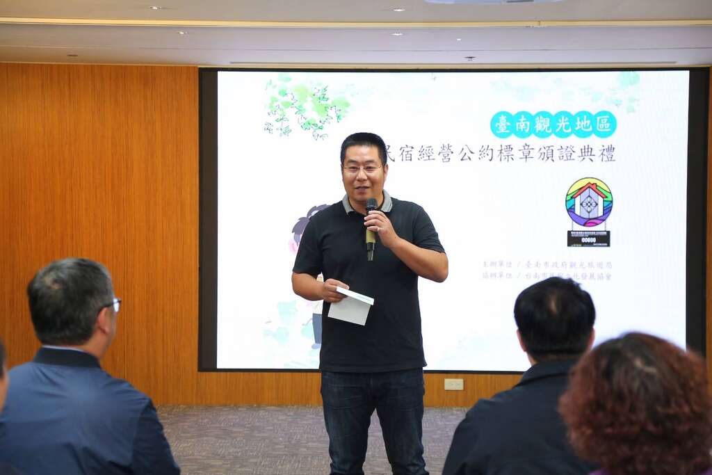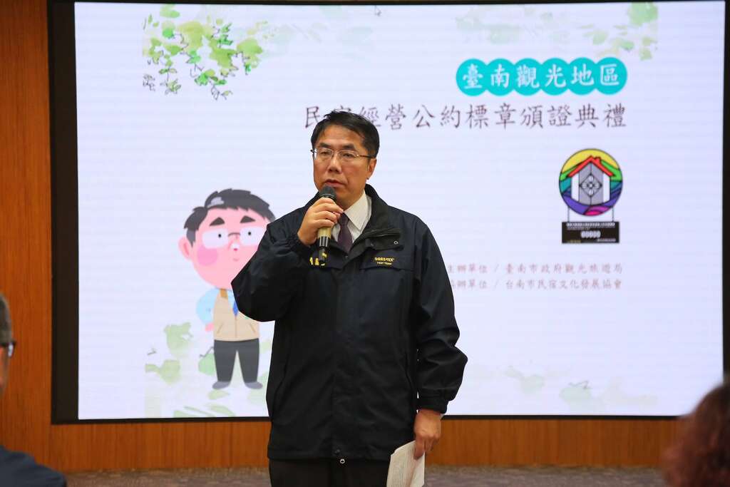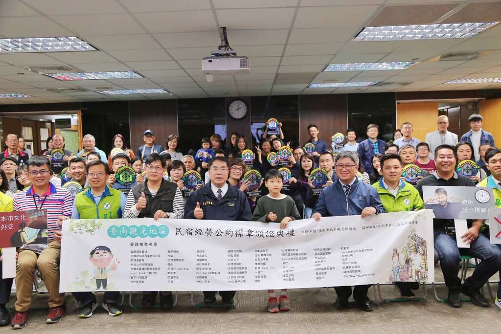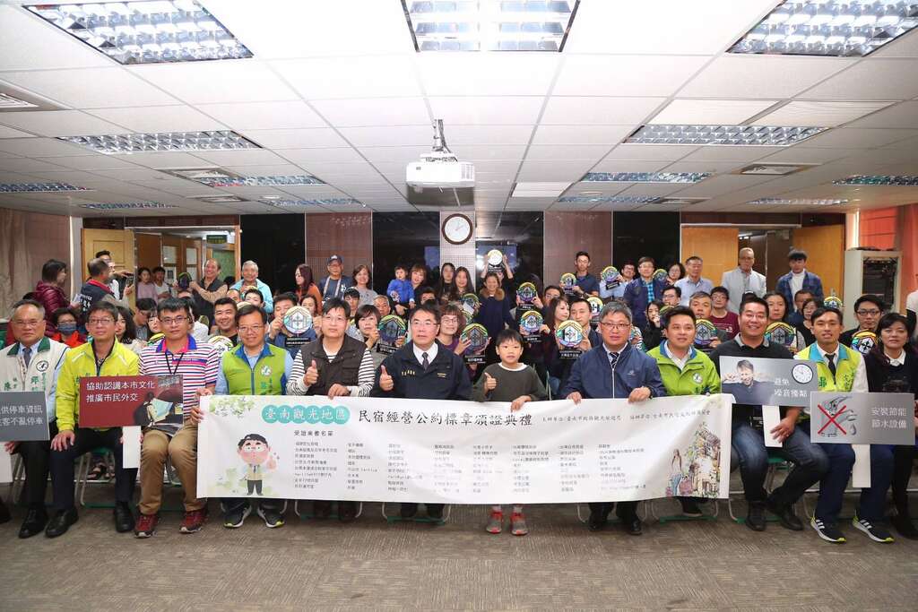 深化文化底蘊並振興觀旅發展為黃偉哲市長的重要施政目標,觀旅局為營造「臺南觀光地區」友善環境及優質民宿品牌形象,特與台南市民宿文化發展協會推動訂定『臺南觀光地區民宿經營公約』,期望民宿業者除以城市主人的身分,導引住宿旅客深入了解本市文化及觀光特色,協助推展市民外交,更期望業者經由節能減廢、敦親睦鄰等措施,共同打造臺南市觀光地區優質民宿品牌,確保旅客住宿服務品質及安全,同時維護居民環境安寧及生活品質,共創臺南市觀光地區榮景。108年度經現場實地評鑑審查符合該公約內容之合法民宿業者計64家,會中由市長親自頒發「臺南市觀光地區民宿經營公約標章」,以表彰民宿業者自律及經營之用心。觀光旅遊局陳信安局長、中西區蕭泰華區長、安平區賴青足區長、呂維胤議員、Ingay Tali 議員、李啟維議員與沈震東議員等亦出席共襄盛舉。