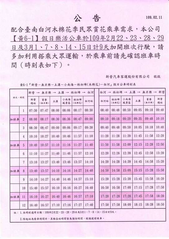 配合臺南白河木棉花季民眾賞花乘車需求,