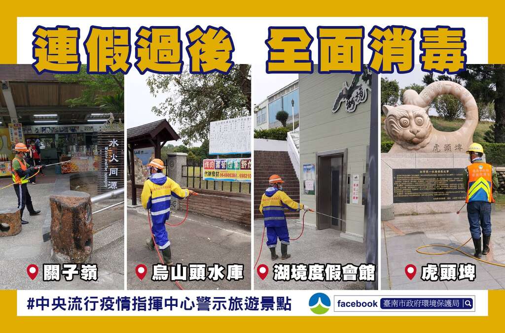 中央流行疫情指揮中心因應清明連續假期各大景點湧現出遊人潮,於4月4日發布「國家級警報」,提醒在11處景點的民眾要保持社交距離。此警報一發,引發大家關切及各方論戰。台南市長黃偉哲表示,台南計有關子嶺、虎頭埤及烏山頭風景區(含園區內湖境度假會館)獲點名,雖然各該景區均屬開放式的戶外型開闊景點,連假前二日每日進出人次約僅2,000至3,500人,惟為讓民眾放心,環保局已於連假最後一日(4月5日)完成各景區與交通節點消毒工作,請大家安心。