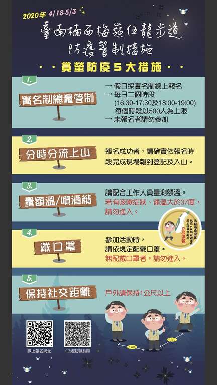 1. 6天假日於伍龍步道入口處,安排工作人員針對登記報名的民眾進行報到登記、量測體溫、噴酒精消毒等工作,報名參加的民眾並需戴口罩方可入山賞螢,額溫超過37度及未配戴口罩者將禁止入山。
