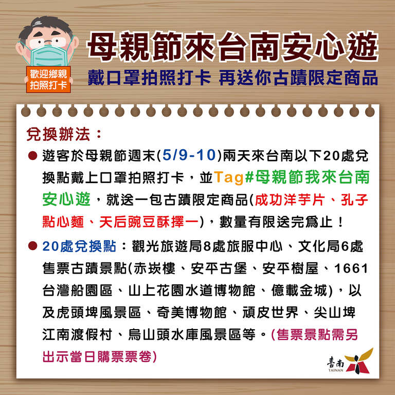 觀光旅遊局郭貞慧局長表示,在做好防疫措施、戴好口罩、勤洗手的前提下,推薦全國遊客來到臺南走走,只要在5月9日(週六)至10日(週日)共計兩日,至觀光旅遊局8處旅服中心、文化局6處售票古蹟景點(赤崁樓、安平古堡、安平樹屋、1661台灣船園區、山上花園水道博物館、億載金城),以及虎頭埤風景區、奇美博物館、頑皮世界、尖山埤江南渡假村、烏山頭水庫風景區、關子嶺大成殿(嶺頂資訊站)等,共計20處地點(售票景點需另出示當日購票票卷),戴上口罩並發布社群貼文打卡標註「#母親節我來台南安心遊」,即可於現地兌換台南古蹟限定商品1包,送完為止。