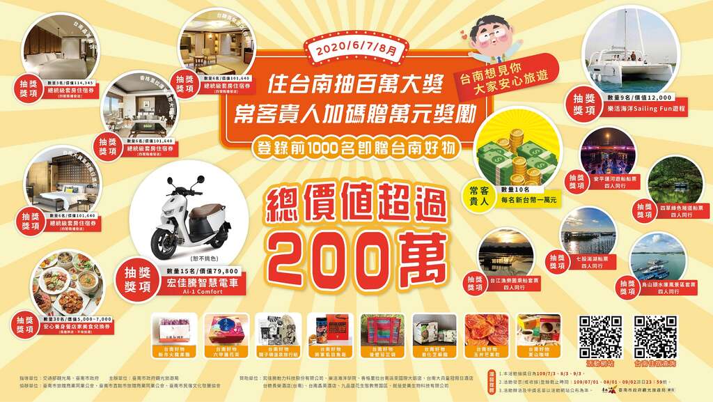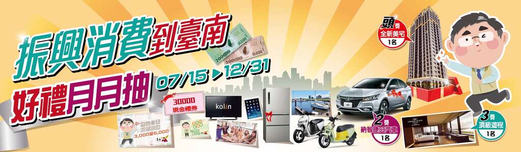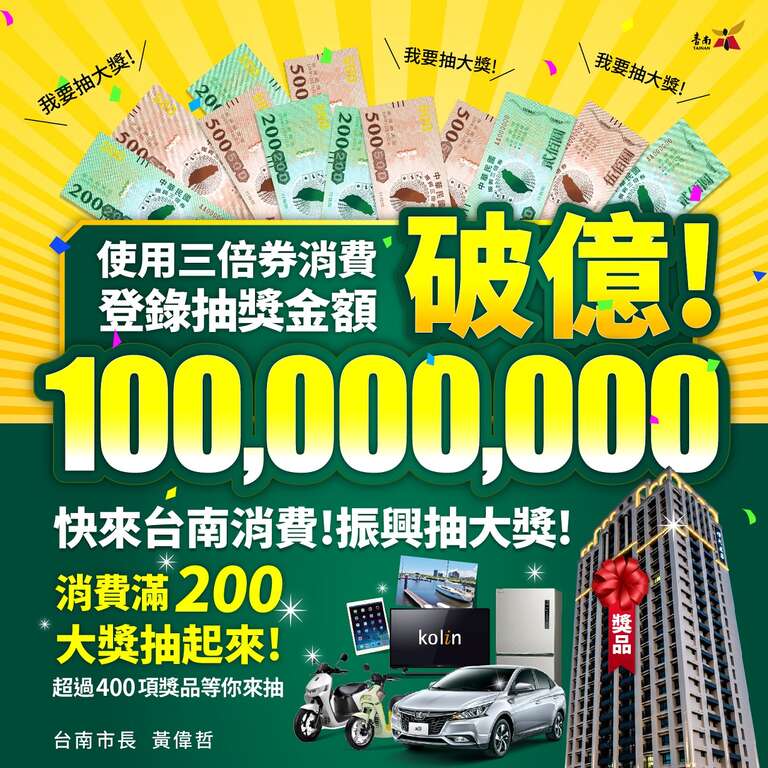 隨著7月1日交通部觀光局安心旅遊補助(1000元)及7月15日經濟部振興三倍券上路,全台各縣市政府無不祭出各項好康加碼活動吸引國旅商機,台南市除了僅限住宿台南的旅客才能參加的「6-8月住台南抽百萬大獎」外,市長黃偉哲更是出奇招,加碼推出「振興三倍券 臺南好禮月月抽」抽五子登科大獎活動,只要在台南消費並取得發票均可參加,最大獎全新房子一戶,據統計,限定住宿方能登錄的金額已超過2000萬元,而有台南消費發票就能登錄的五子登科月月抽活動累計登錄金額更已突破億元大關。
