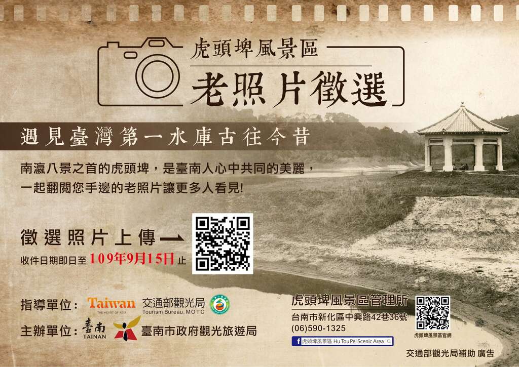「遇見臺灣第一水庫古往今昔」虎頭埤風景區老照片徵集活動,於即日起至9月15日止,只要是1990年前於虎頭埤風景區內拍攝各式各樣的照片,即可透過紙本郵寄或線上填表方式投稿,預計將遴選出30張老照片,並致贈每張照片一千元使用及典藏費,詳細活動內容請見虎頭埤風景區官網,相關問題可洽詢虎頭埤風景區呂小姐(06)590-1325。