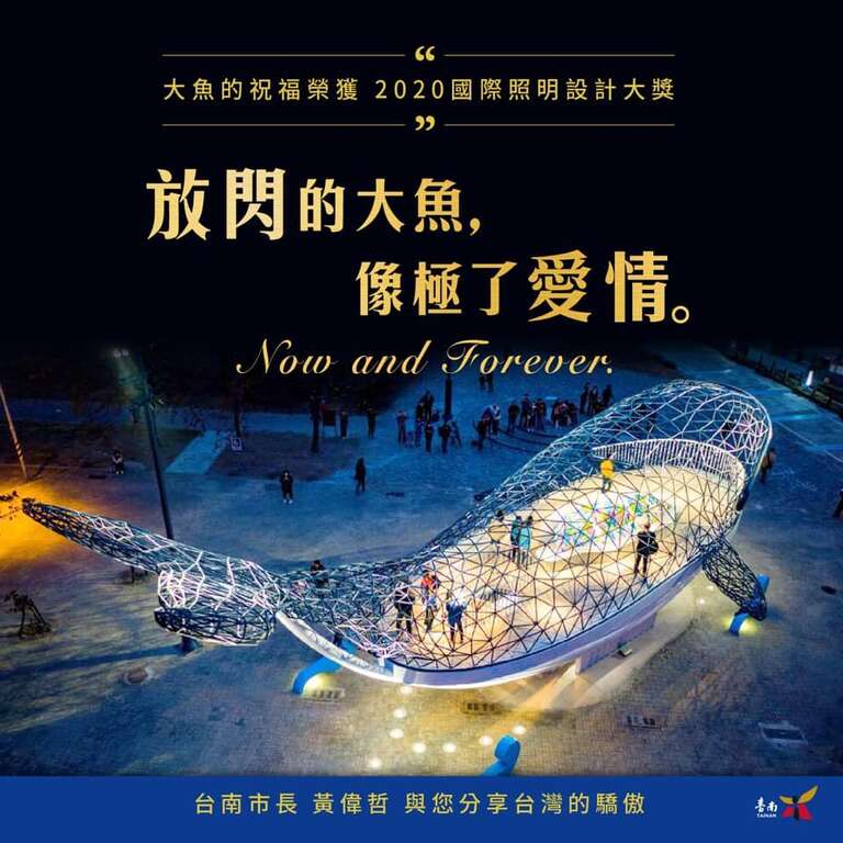 「大魚的祝福」繼榮獲2019年台灣景觀大獎後再傳捷報,由日光照明為「大魚的祝福」設計的燈光照明榮獲「2020 IESA 美國國際照明設計大獎」,IESA是國際性照明設計師同台競技的藝術殿堂,黃偉哲市長開心表示,安平是臺南重點觀光區域,因此特別督促觀光各方面要更加強表現,「大魚的祝福」再度榮獲國際評審青睞相當不易,恭賀日光照明的優良作品能在國際獲獎發揚光大,同時也肯定市府團隊對於打造觀光新亮點的用心與努力。