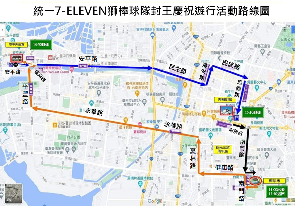 市府也體恤球員平時辛勤練球及比賽,實在無暇體驗台南觀光,特別有別於一般的遊行活動,安排兩台雙層巴士讓球團、球員及萊恩獅、魚頭君及UniGirls們以不同的視角來認識與體驗不一樣的台南。遊行路線經雙方討論後,起訖點均為台南棒球場,預計短暫停留安平開台天后宮及臺南市美術館2館等二處,整個隊伍將從下午2點出發,預計2點半抵達安平開臺天后宮還願,統一7-ELEVEn獅曾前往開臺天后宮祭拜,期許獅隊能夠勇奪第10座總冠軍金盃。此次獅隊全體齊心奮力奪冠達成願望,一定要安排球員前往還願及感謝廟方對球隊的支持;而第二站的臺南市美術館2館則預計下午3點抵達,短暫停留的時間將由萊恩、魚頭君及UniGirls及球員們與現場的球迷們致意與簡單互動,遊行活動預計下午3點半結束封王遊行並返回到台南棒球場,與下午2點即開放進場的各地球迷們進行總冠軍感謝球迷見面會。