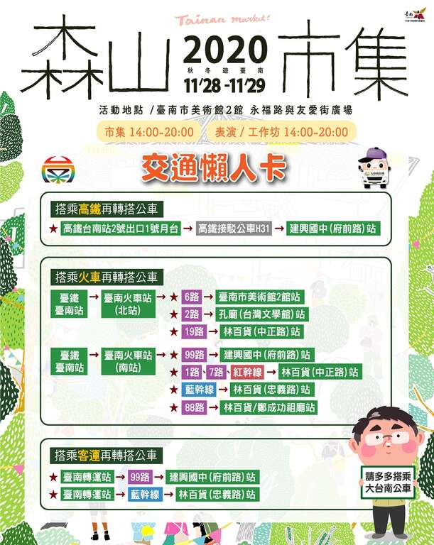 觀光旅遊局建議參加活動的民眾可搭乘大台南公車6路公車於府前路一段臺南市美術館2館站下車,或者搭乘藍幹線至林百貨 (忠義路)站下車,搭乘1、7、19、紅幹線至林百貨 (中正路)站下車,而活動會場周邊有2、88、99等公車可抵達,歡迎大家搭乘大眾運輸前往。此外,自行騎車或開車的民眾也可多利用「台南好停APP」,將車輛停放於會場周邊停車格或停車場(可停車於南美館2館地下停車場、永福路停車場(嘟嘟房)、新光三越西門店等停車場),並謹記停放位置,此外,欲前往「貴人散步音樂節LUCfest」5個Showcase展演場館的民眾,除可視距離步行抵達外,也歡迎租賃使用T-Bike公共自行車、電動機車等綠色運具輕鬆的低碳慢遊臺南各景點。更多詳細活動與交通資訊請上臺南城市音樂節官網、貴人散步音樂節官網、台南旅遊或撥打06-6353226洽詢。