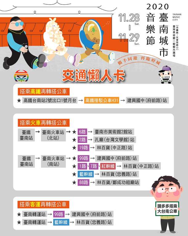 由臺南市政府觀光旅遊局及貴人散步團隊主辦之「2020臺南城市音樂節暨貴人散步音樂節」即將於11月27日至29日帶來連續三天的音樂盛會!臺南城市音樂節將於11月28日至29日於臺南市美術館2館戶外廣場(忠義路二段與友愛街路口)打造免費戶外主舞臺,11月28日力邀結合戲劇、舞曲、女裝等創意元素的人氣紅不讓台版百老匯樂團「毀容姊妹會」打頭陣,接力今年強勢入圍金曲獎的超夯樂團海豚刑警、今年金音獎得主傷心欲絕、饒舌界校長大支以及音樂詩人雷光夏帶來精彩演出。11月29日邀請重金屬指標樂團血肉果汁機、低科技俗氣樂團美秀集團、秒殺級夯團落日飛車、草根搖滾樂團拍謝少年以及演唱雙棲創作歌手舒米恩壓軸登場。活動兩天友愛街(忠義路至永福路段)將實施交通管制,同時建議樂迷朋友們多加利用大眾運具抵達演唱會會場。