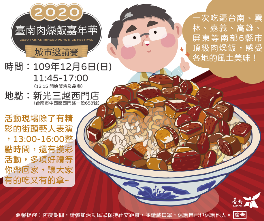 黃偉哲市長表示,活動現場因人潮眾多,請全程佩戴口罩,若有呼吸道及發燒症狀請勿前往參加活動,以確保自身及他人安全。觀光旅遊局郭貞慧局長表示,為配合防疫工作,現場工作人員(含市集及表演者)均實施實聯制以實名登記,建議有確定會參加活動的民眾,活動前先到以下連結(2020臺南肉燥飯嘉年華暨城市交流邀請賽https://forms.gle/WQAkJ3H7CucxcvpHA)填寫您的聯絡資料,如果與家人、朋友共同參加,可填寫一位代表聯絡人即可,以利全民防疫。