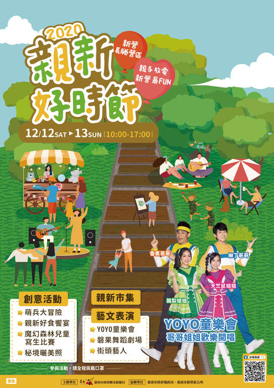 觀光旅遊局郭貞慧局長表示,這次的活動規劃有三大體驗活動,包含具現地元素的軍事趣味體驗「萌兵大冒險」,讓孩童們裝扮成小小軍人,在遊戲互動中學會團結分工,學習軍人的紀律與勇敢;同時集結臺南甜點、鹹食及飲品共8項特色點心的「親新好食饗宴」,讓民眾一邊享受草地景色,一邊品嚐道地點心;以及讓孩子可以發揮創意將長勝營區美麗的生態、壯觀的綠色隧道,用畫筆記錄下來的「魔幻森林兒童寫生比賽」(12月13日),報名網址https://reurl.cc/d5vpzg。而以上三項活動於開放網路開放後,目前寫生比賽尚有名額,歡迎大家踴躍報名。除了這三項活動之外,這兩天活動現場也邀請到小朋友最愛的YOYO哥哥姐姐(12月12日柳丁哥哥、天竺鼠姐姐;12月13日香蕉哥哥、酪梨姐姐)、新營在地的磐果舞蹈劇場及街頭藝人演出,更安排親新市集、秘境曬美照、免費志工導覽、舞台互動遊戲等精彩內容,12月12日晚上在新營文化中心也有聖誕點燈活動,歡迎爸爸媽媽帶著小朋友一起來長勝營區欣賞表演、逛市集,享受一個美好的週末。