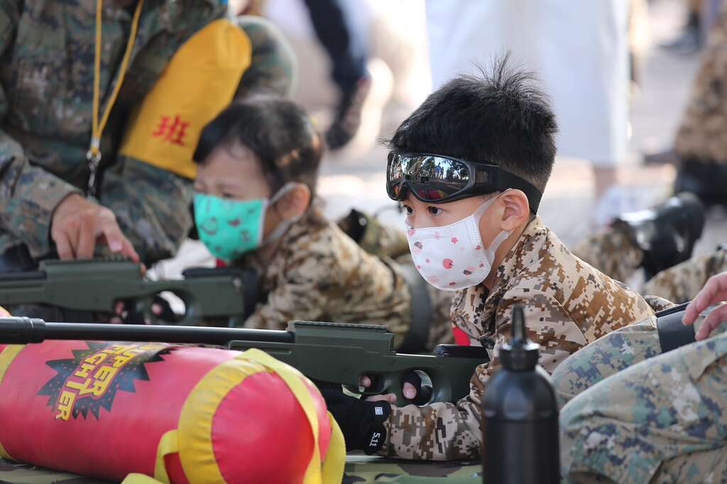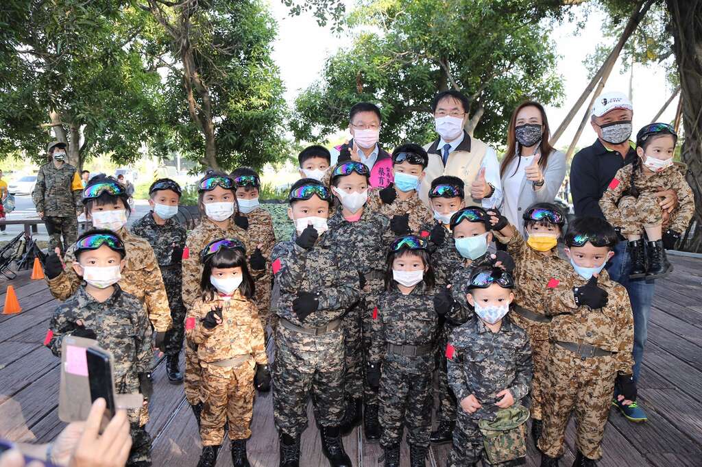 而長勝營區過去為陸軍軍事用地,如今呼應此背景辦理的「萌兵大冒險」特別有意思,讓孩童從遊戲中體驗軍事文化,寓教於樂,現場穿著迷彩軍服的帥氣小萌兵們,在班長的帶領下逐一完成各項操兵挑戰,包含匍匐前進訓練手腳協調度、水彈槍射擊考驗孩子的手部穩定度與準度,還有搶救娃娃傷兵則教導孩子如何協助需要幫助的人等,每位參與的小萌兵們都感到十分新奇,玩得不亦樂乎,一旁的家長更是拿起相機跟手機猛按快門拍下珍貴的畫面,為孩子留下美好的紀念。