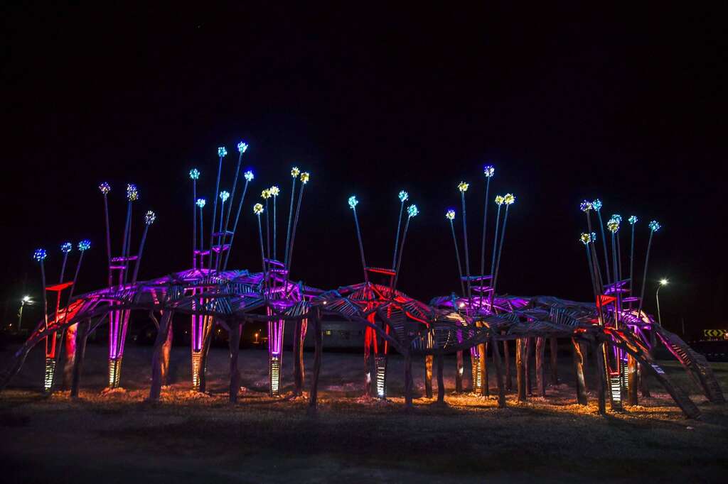 「2021綠汕帆影馬沙溝新春地景」還有邀請其他藝術家進行地景藝術創作,包括以漂流木為主的「逐浪」藝術、以水紋為元素的「波光漣連」,還有社區內宗教信仰中心,觀音巖(麒麟獻瑞)、清水宮(祥雲瑞馬耀平安)、烈池宮(時來運轉)。此外,也以當地兒童遊戲區發想創意,邀請到長平國小許國煌校長和林惠雯美術指導老師,帶領著長平國小的學生一同進行兒童童樂區的造型彩繪,每個孩子都卯足全力、創意十足,透過長平國小學生的彩繪為馬沙溝新春地景注入青春活力。此外,雲嘉南管理處228連假期間於北門遊客中心廣場也會有2021台灣燈會的副燈「犢站金榜」及懷舊時光燈區展出,歡迎民眾前來參觀。