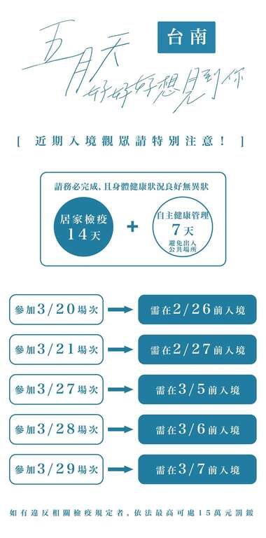 黃偉哲市長現場表示活動首重安全,也責請市府各局處全力協助將活動順利完成,黃市長也肯定主辦單位對於各項準備工作之用心,尤其在防疫工作上的落實,更感謝周邊居民的配合。最後再次呼籲參加活動請務必遵守交管引導及多利用接駁車與大眾運具前來,並請配合現場各項防疫規範,居家檢疫、居家隔離、自主健康管理期間者,及有發燒、呼吸道症狀、腹瀉、嗅味覺異常等疑似症狀之民眾,不得參加。入場觀眾均採實名制,進場需要準備身分證與門票,觀賞演唱會請全程佩戴口罩,以及現場全面禁止飲食等,讓我們一起珍惜臺灣得來不易的防疫成果,一起做防疫的典範。