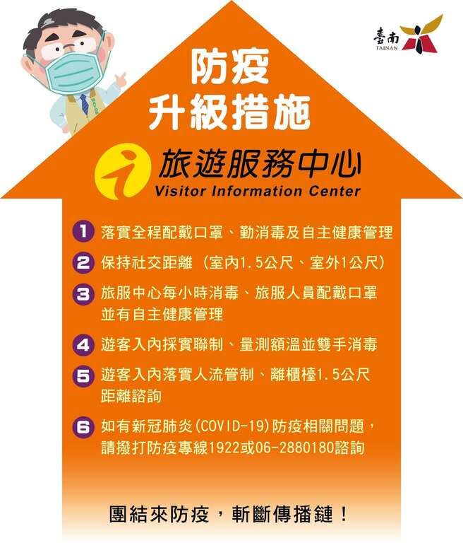 - 如有新冠肺炎(COVID-19)防疫相關問題,請撥打防疫專線1922或06-2880180諮詢。