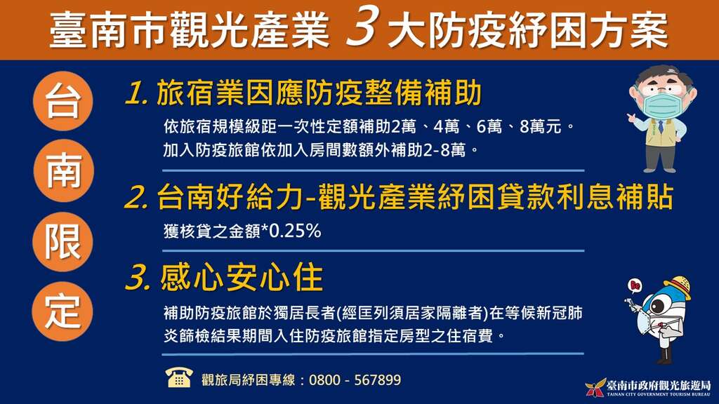 臺南市政府觀光旅遊局紓困專線:0800-567899(免付費)、(06)635-0067 2021/06/24